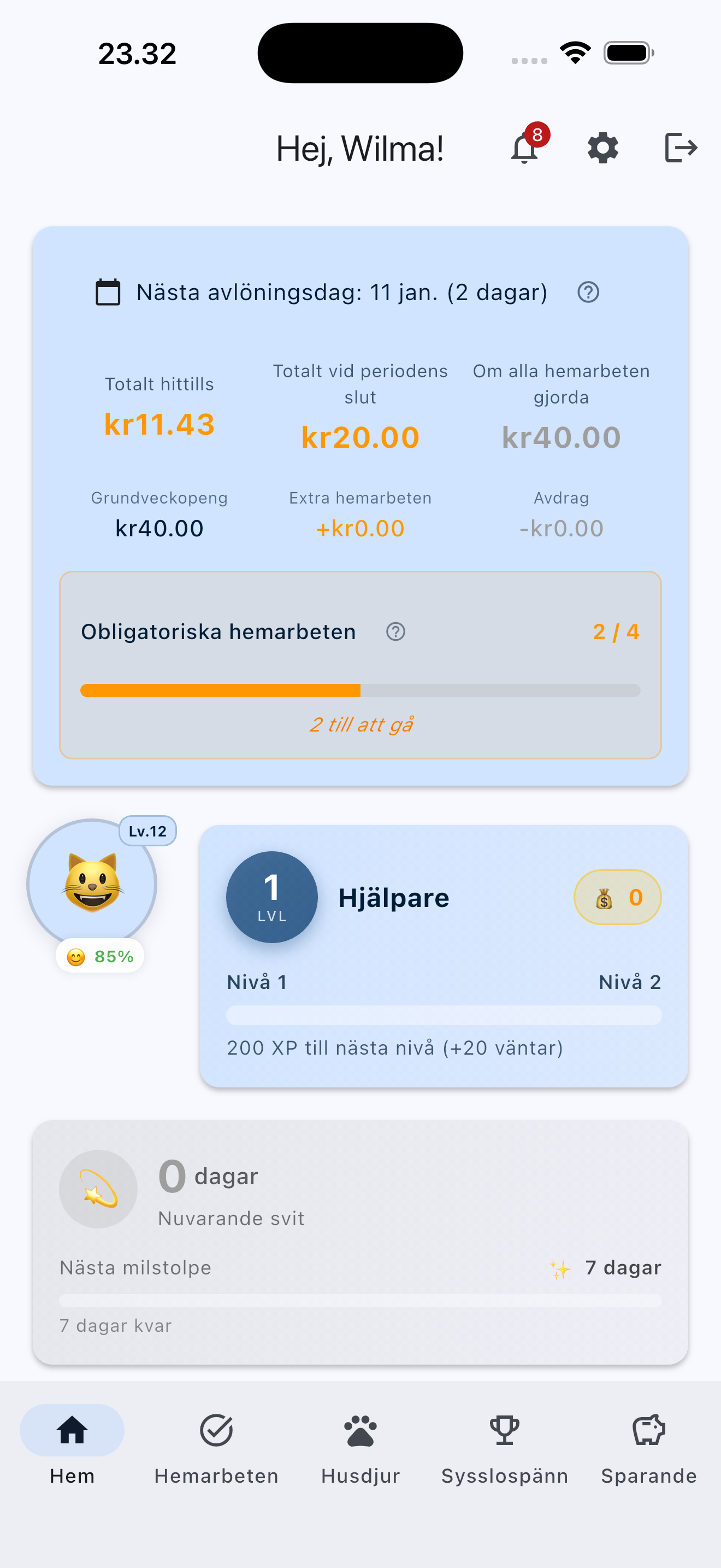 Barn ser tillgängliga hemarbeten, markerar dem som klara och begär godkännande. De följer intäkterna som växer mot utbetalningsdagen.