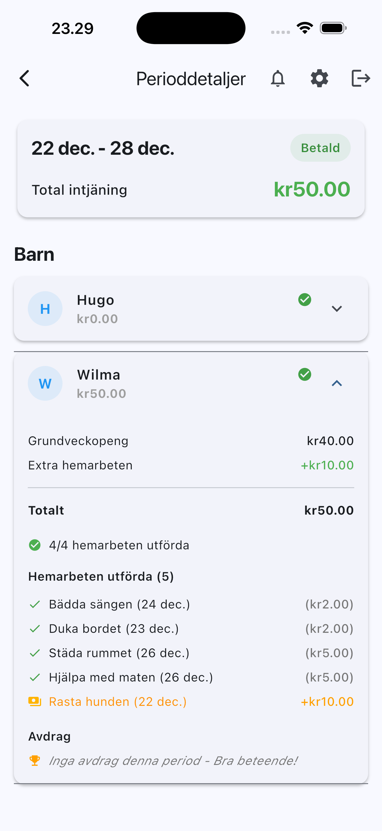 Föräldrar får notiser, granskar utförda hemarbeten och godkänner med ett tryck. Markera betalningar som slutförda på utbetalningsdagen.